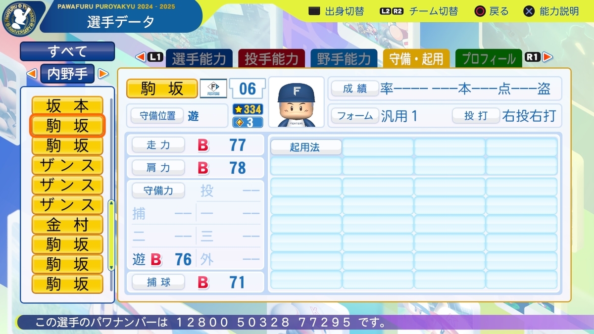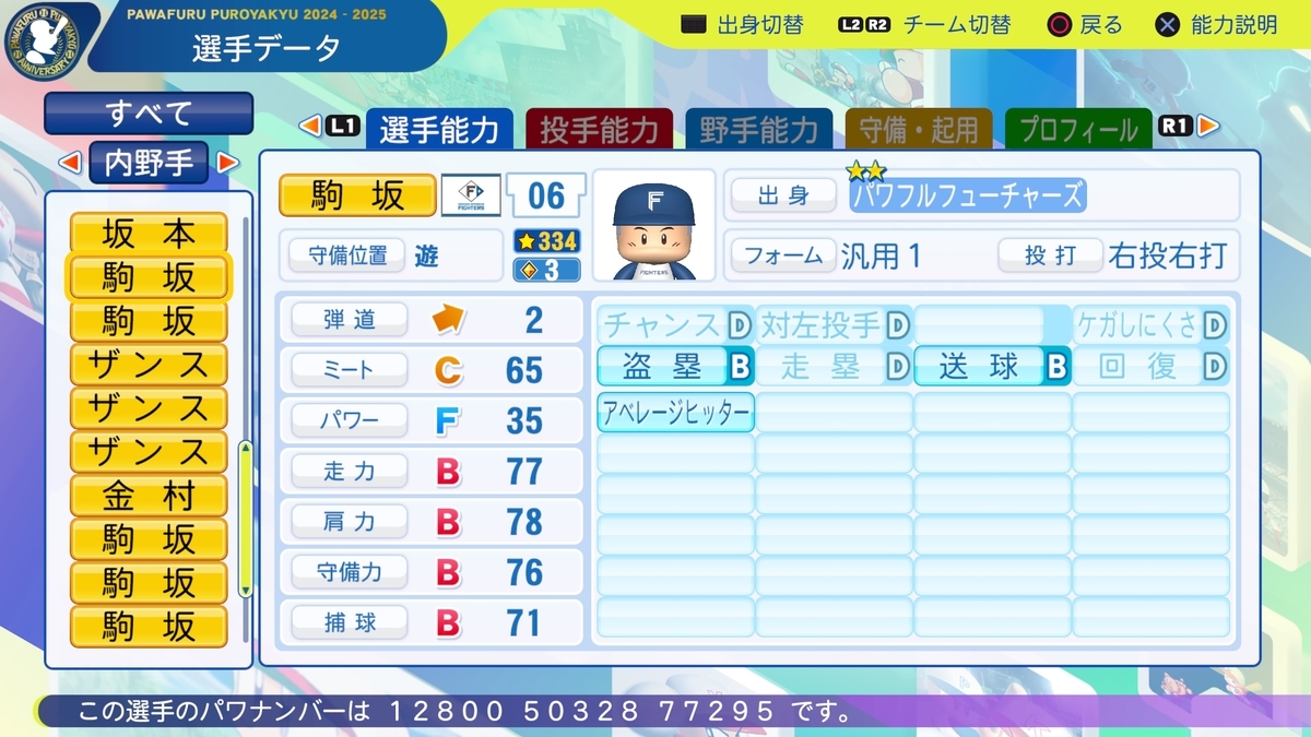 デフォルトの能力から打撃能力を削った形の能力。特殊能力はそのままで当時としては破格の性能。3年目に入ってくる後輩としてかなり頼もしい存在だっただろう。