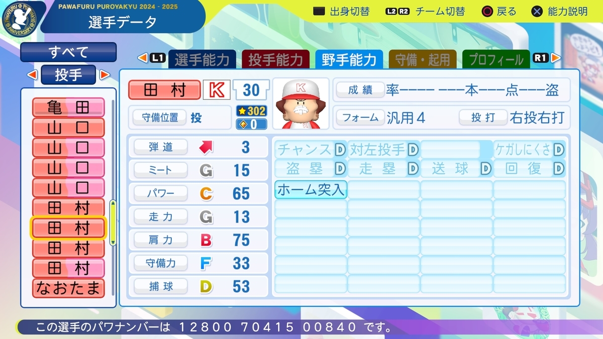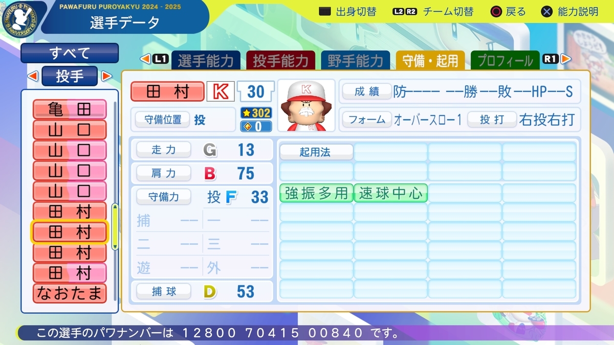 能力はデフォルトと比較すると制球が下がった一方で球速とスタミナが若干増加、パワーもCまで伸びている能力。特殊能力は大きな特徴であった重い球が消えており、全体としてはやや弱体化した印象。