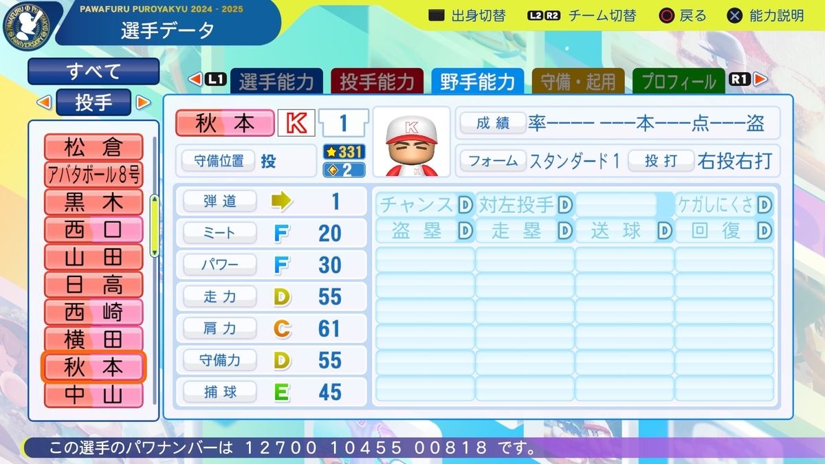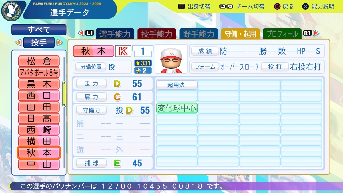 ご尊顔の画像ではどっちが秋本かわからず、変化球投手であることから後ろのモミアゲがそれっぽいなと思いましたが、目の前の男をパワターにしました。違う場合は教えてください。