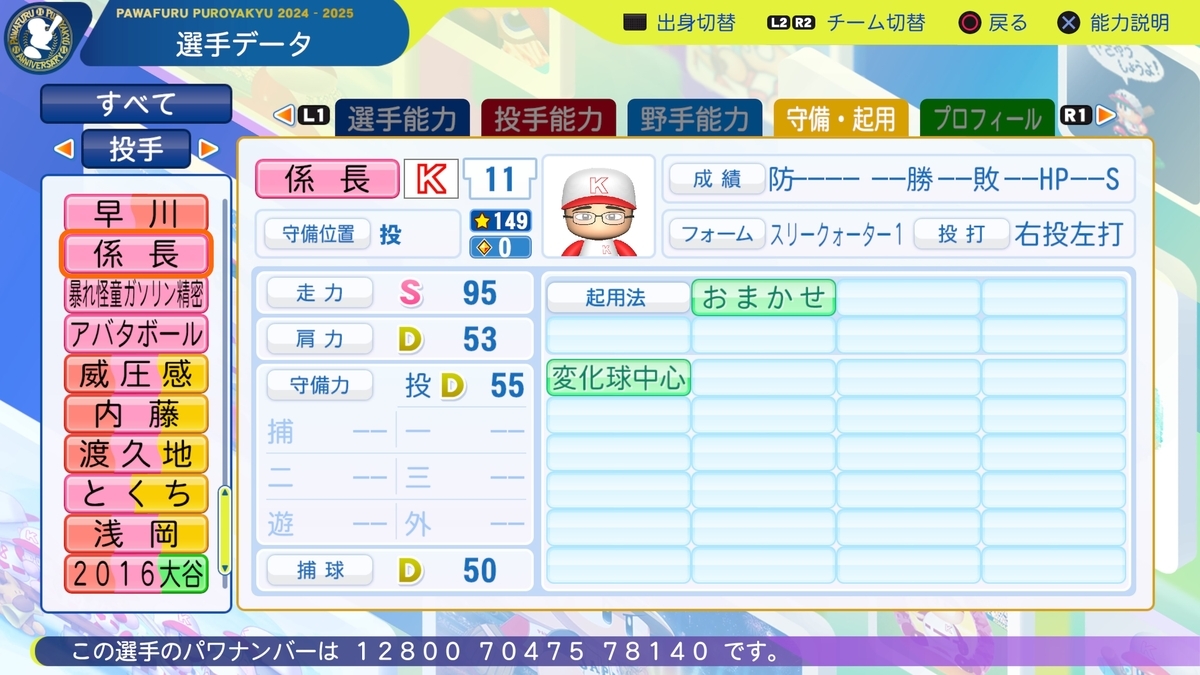 能力はラスボス枠の中継ぎとしては非常に弱い。が、野手として見るなら全然別になる。非常に優れすぎたともいえる脚力と走塁・盗塁技術が特徴で左打ちも相まって内野安打を築ける優れた野手。打撃能力は弱いものの代走として十分通用する。