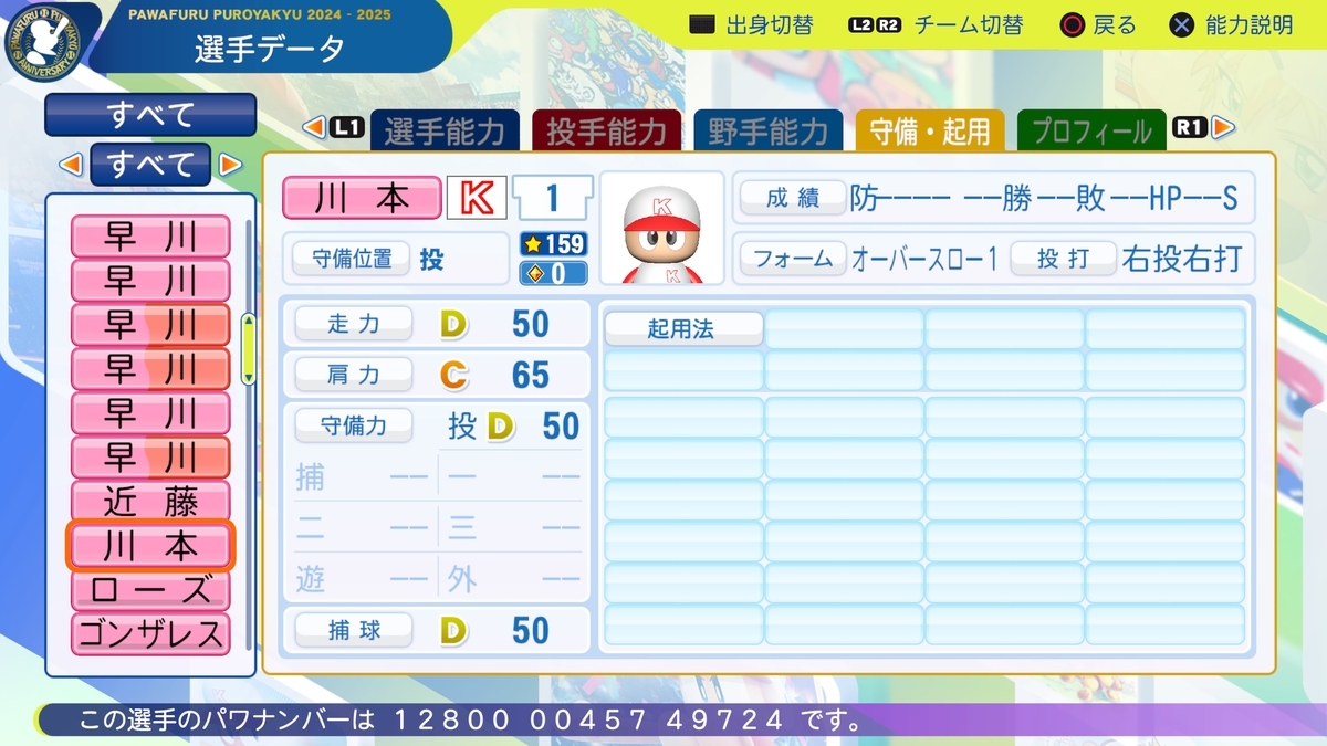 能力はスローカーブとシュートで総変化8とそこそこ。ただ特殊能力がなくコントロールも悪いため、やや使い勝手は良くないか。