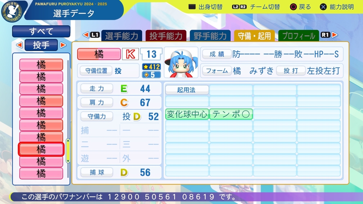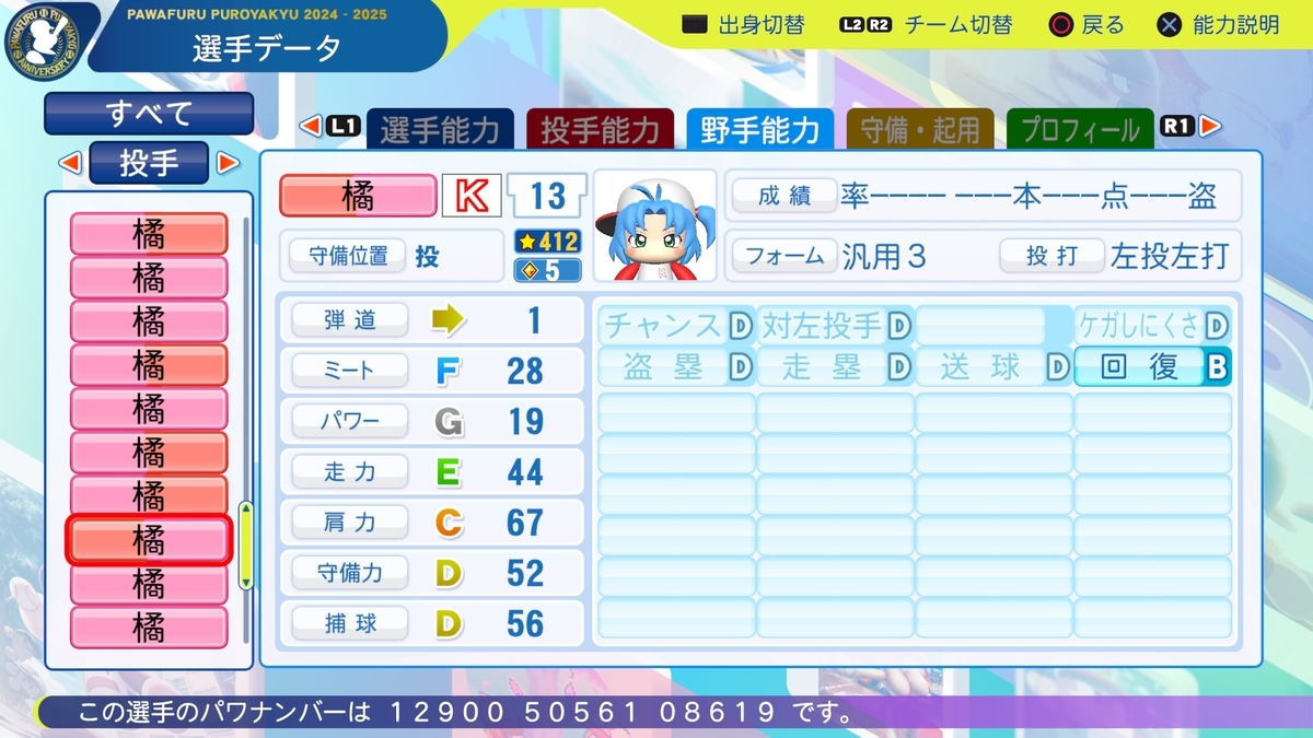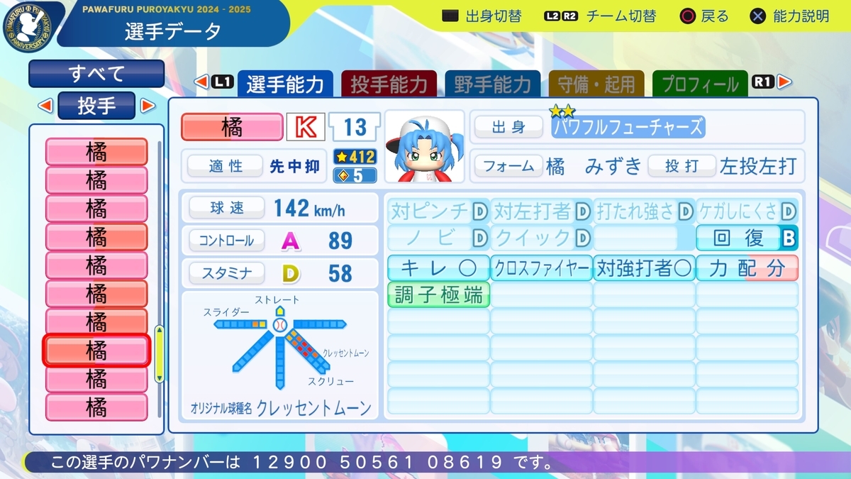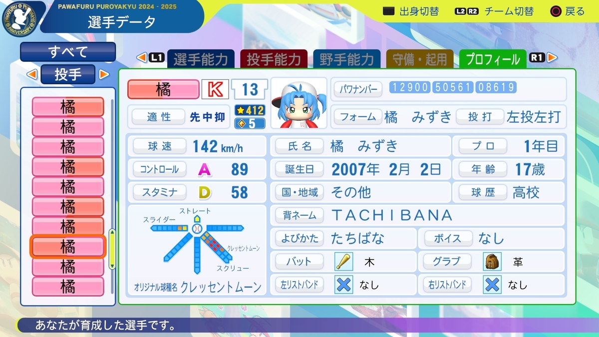 デフォルトから基礎能力とスライダーとスクリューの変化量が上昇。特殊能力もキレ○、対強打者○が追加され全体として強力に。Lv.13に成長するまで育てるプレイヤーは少ないかもしれないもののリリーフとしてはある程度頼れる存在と言えるか。