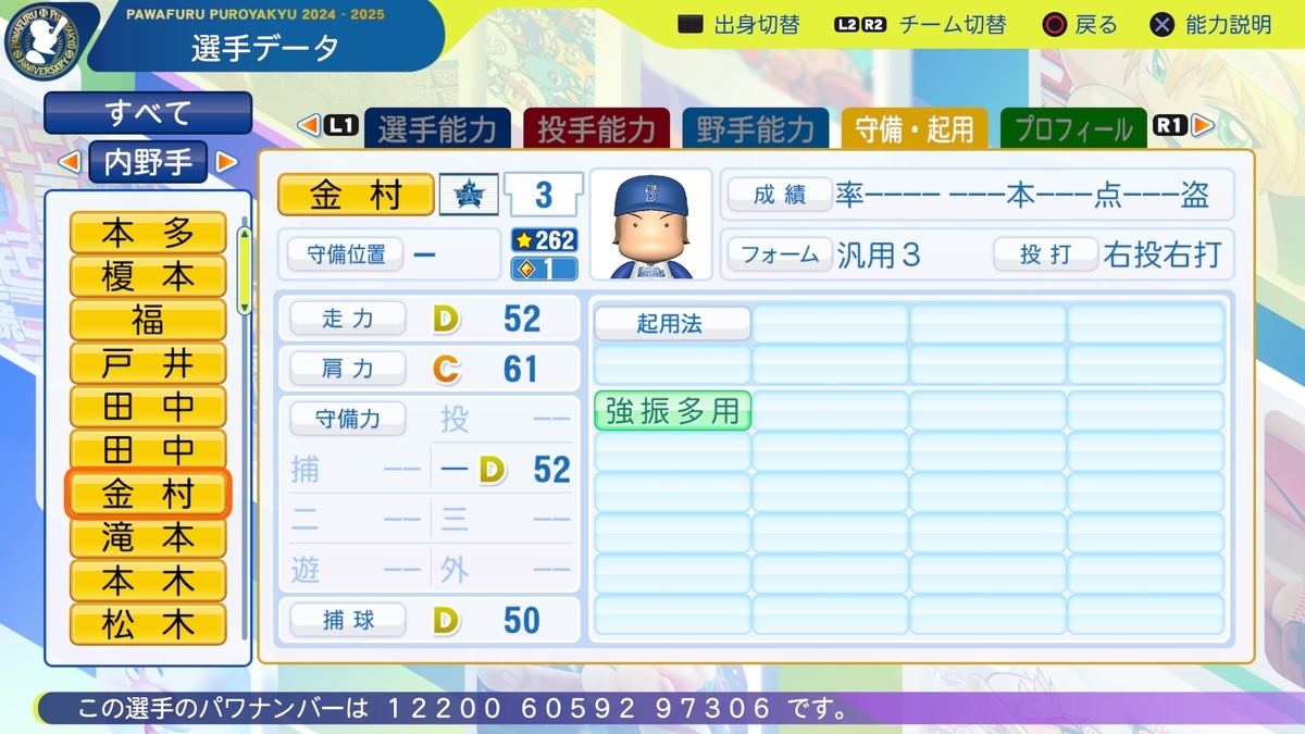一発が怖い一塁手。パワーA80にパワーヒッターを兼ね備えた典型的なスラッガー。守備もそれなりに出来、一塁手としてはそこそこできる。