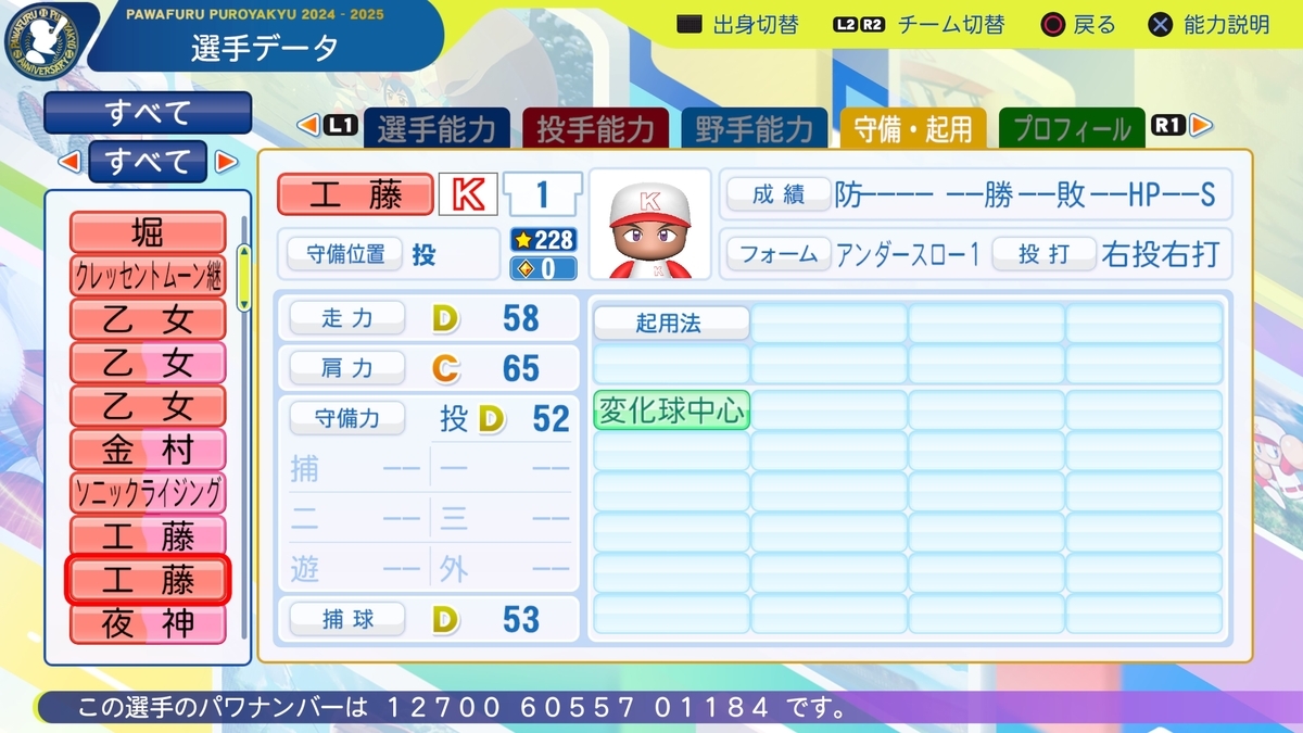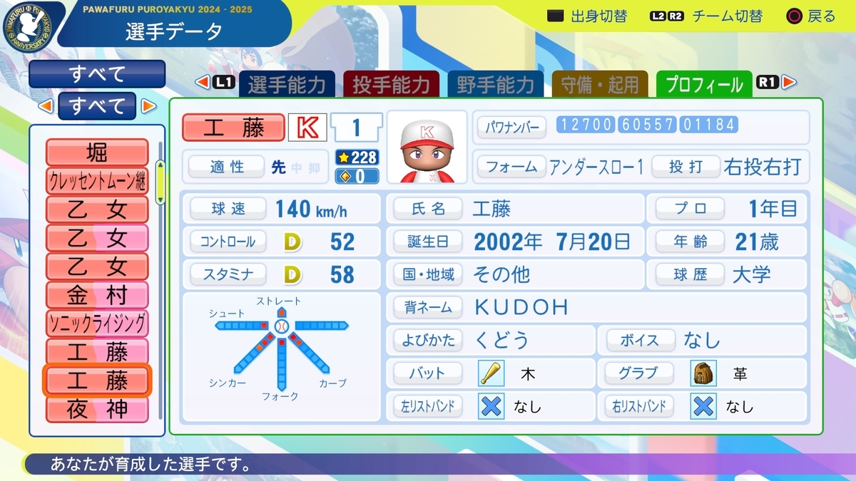 元が4球種と非常に強かったため、ドラフト用としてかなり弱体化させています。それでも強力なことには違いないのでドラフトに入れたら数球団の競合になるかもしれません。ご使用の際は一度テストプレイしてから入れるかどうか判断してください。