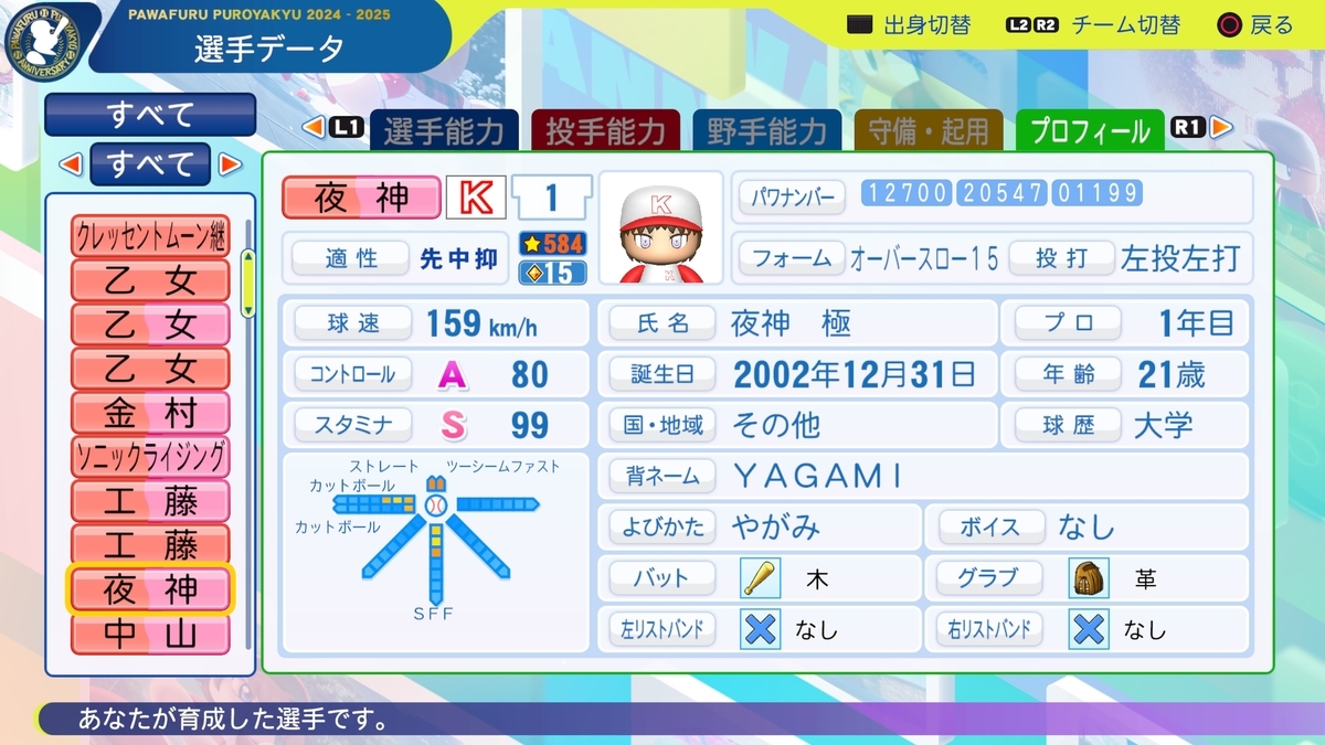 アプリ版では弾道が3でコントロールがA83で第二球種のカットボールがないですが、正直作りたいと思わないので作りません。特殊能力用の継承選手を入れて、ヤンスブレイクでスタミナ練習と守備練習を続けて博士が成功して途中でラブパワーとか挟んでおけば大体作成可能なので欲しい人は自分で作ってください。
