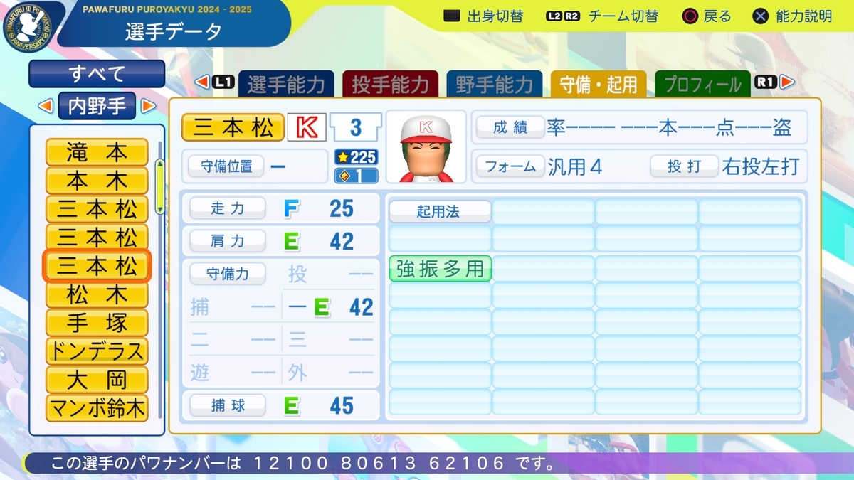 能力はミートの弱体化も加味してパワーはAにしました。かなりの三振製造機になると思いますが、ドラフト用選手としてはそれくらいの方がいいんじゃないかと思います。ミートが上がっていくつか特殊能力が増えれば十分に戦力になると思います。